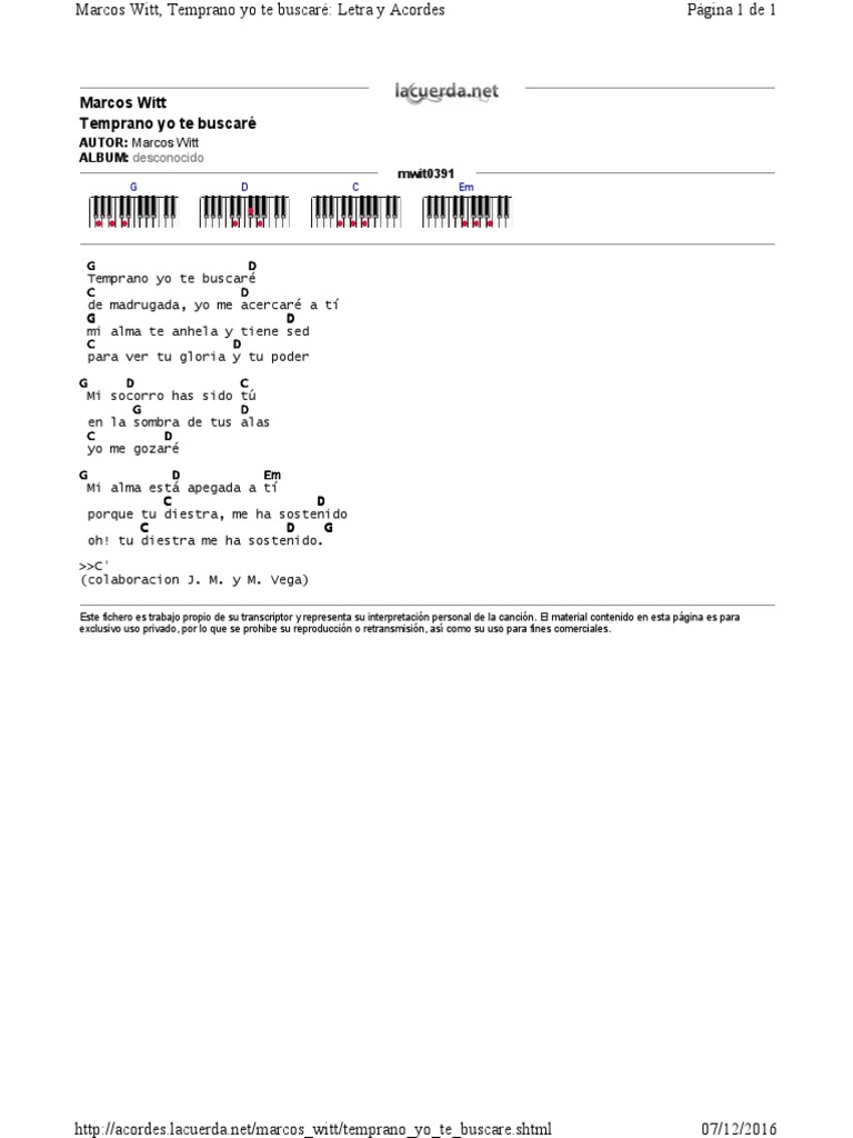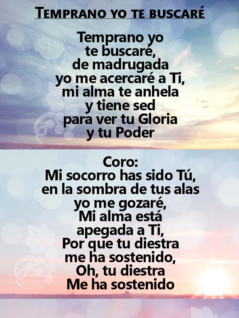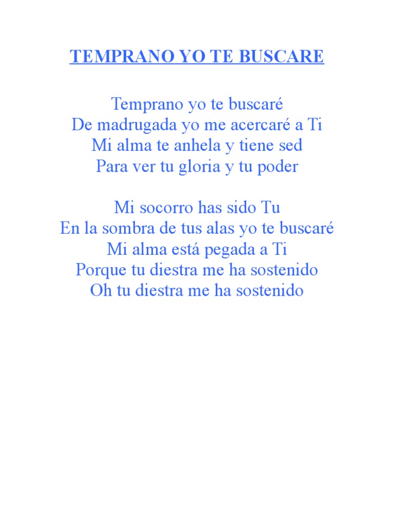 Alabanza temprano yo te buscaré. Temprano yo te buscaré De madrugada yo me acercaré a Ti Mi alma te anhela y tiene sed. Señor Tú has sido mi socorro. IntroG-C G D Am D Temprano yo te buscare de madrugada yo me acercare a ti G D Am GB C D mi alma te anhela y tiene sed para ver tu gloria y tu poder.