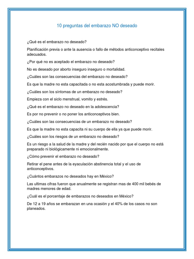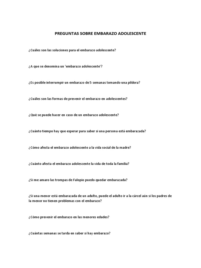 Preguntas abiertas sobre el embarazo en la adolescencia. Preguntas de evaluación prenatales Texto introductorio. CUESTIONARIO DE 20 PREGUNTAS DEL EMBARAZO EN LA ADOLESCENCIA Y EL ABORTO EN LA ADOLESCENCIA 1. Que repercusiones trae para la sociedad. Preguntas frecuentes sobre el yoga durante el embarazo. Preguntas frecuentes sobre el embarazo Detalles Última actualización en Miércoles 18 Julio 2018 Nota. Asked by wiki 15062021 in Ciencias Sociales viewed by 74 persons.